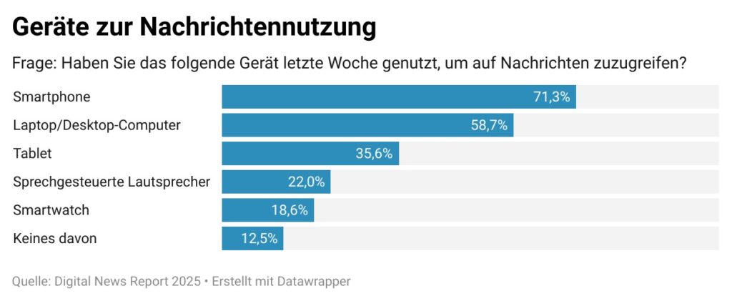 Eine aktuelle Erhebung des Digital News Report 2025 zeigt deutlich, dass das Smartphone inzwischen das meistgenutzte Gerät für den Zugriff auf Nachrichten ist: 71,3 Prozent der Befragten gaben an, in der Vorwoche Nachrichten über ihr Smartphone gelesen zu haben. Erst mit deutlichem Abstand folgen Laptop oder Desktop-Computer (58,7 Prozent) sowie Tablets (35,6 Prozent). Diese Zahlen unterstreichen den anhaltenden Trend zur mobilen Nutzung und verdeutlichen, warum ein „Mobile First“-Ansatz bei der Gestaltung von Nachrichtenwebsites heute als Standard gilt.